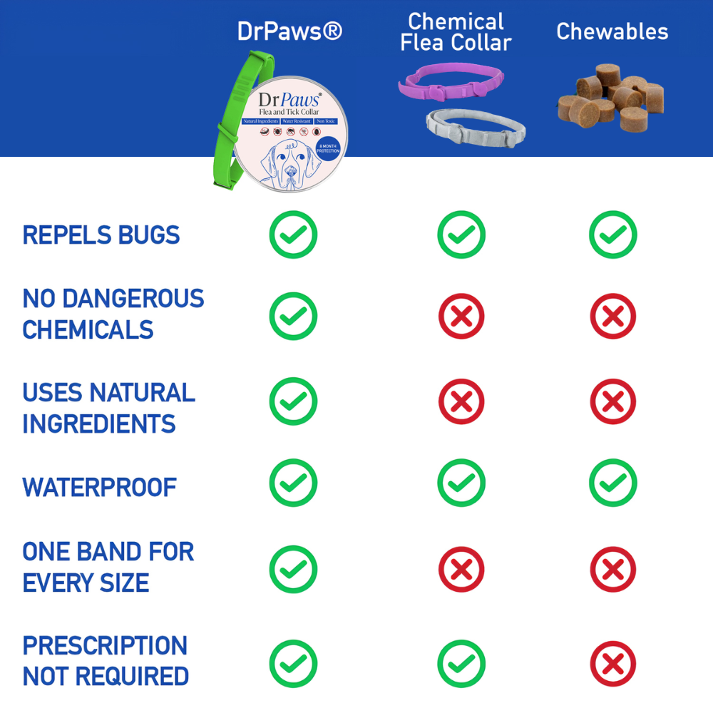 DrPaws® Flea and Tick Free Collar stands out as a natural, chemical-free alternative to conventional pet collars. Suitable for all sizes and waterproof, it offers effective, non-toxic protection without a prescription. Ideal for eco-conscious pet owners, it's a safer, environmentally friendly choice for your pet's well-being.